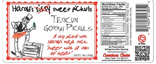 The Sissy Sweet was born out of disgust, pure and simple. Harold had spent several years gathering the proper ingredients for The Original Beer Pickle, a super hot, salty dill pickle that was so perfect and crispy that he felt he had reached the paramount in his pickling skills. Not only was The Original Beer Pickle ever so tasty and crunchy, it had healing qualities, how could anyone not like it? For those that don’t know, Harold spends many hours every week cutting up pickles to sample and feeding the appetite of anyone willing to say, “Gimme a taste of that there pickle.” Day after day Harold was handing out samples of Frances Cowley’s, his awarding winning and ever so popular 2X and 4X Texicun Gormay’s and the crème de la crème of them all, The Original Beer Pickle. He was giving folks the best pickles they had ever tasted and ever so often someone would say in a whiney type voice, “Ya got any bread-and-butter pickles, you know, sweet ones? “ At first Harold wanted to reach out and choke them but his gentleman manner and high self control found restraint. He basically did the civil thing and replied, “NO, ONLY SISSY’S EAT SWEET PICKLES”… if the person replied, “Well, we only like sweet pickles.” He would call security and have them escorted away.(for their own protection of course.) As a reasonable man and a friend of many, the question of sweet pickles came up more and more as his fame grew. Finally after the gazzillionith time of someone asking if he made a sweet pickle he had enough. He goes into the kitchen at the shed and starts experimenting. First he burned a hole through a table, then he caught glass on fire and finally after months of experimenting and throwing caution to the wind he finally came up with a sweet pickle that didn’t challenge his manhood. A happy ending to this story is that Harold now loves sweet pickles and thinks this could be his most unique flavor yet.