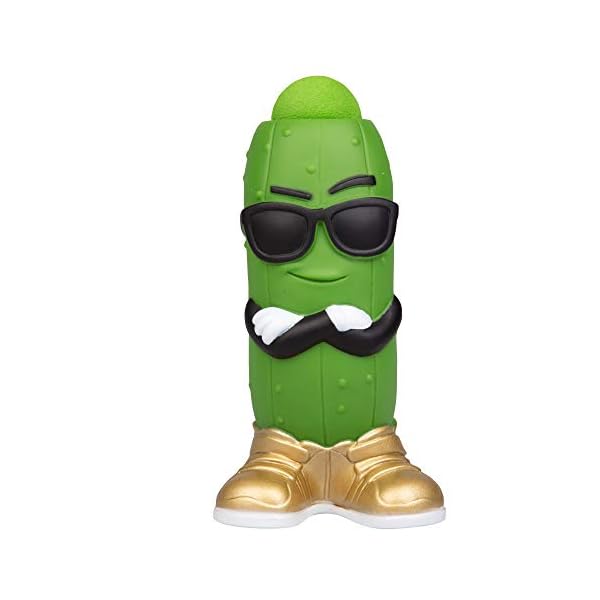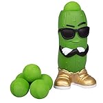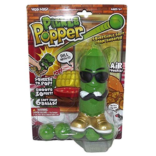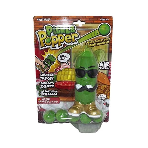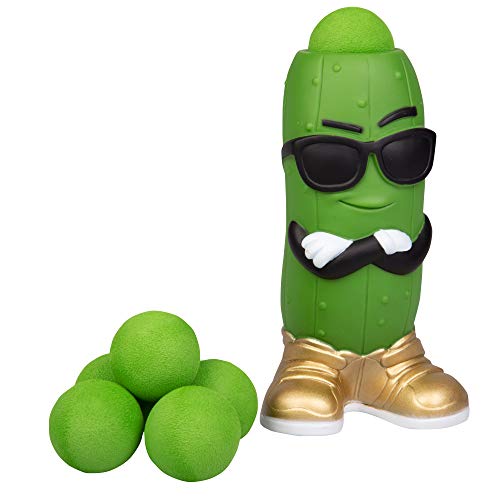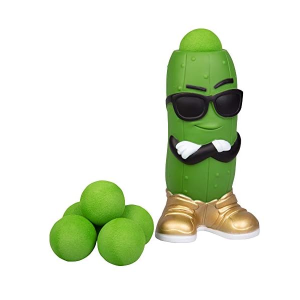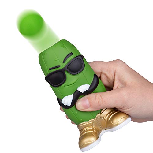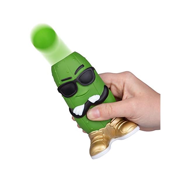 Ready, aim, POP! Squeeze the Pickle Popper toy’s belly to shoot a soft foam ball up to 20 feet!