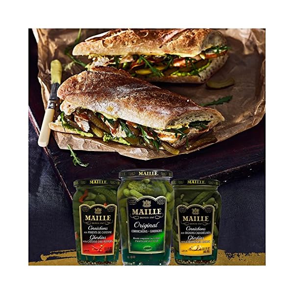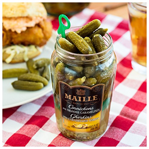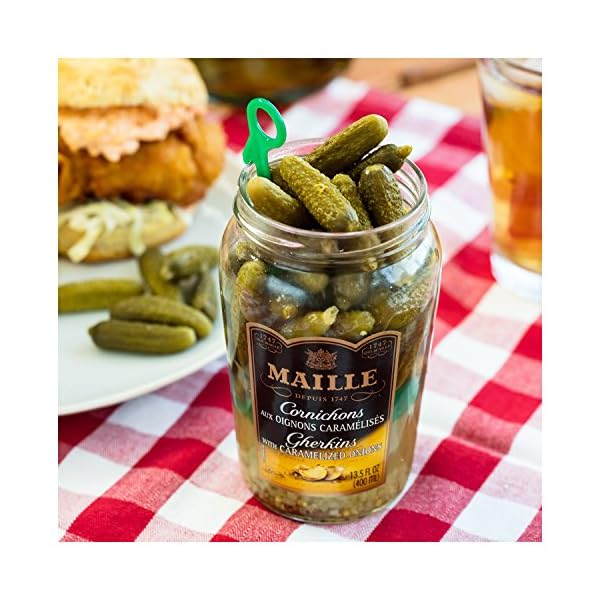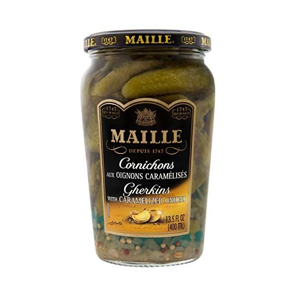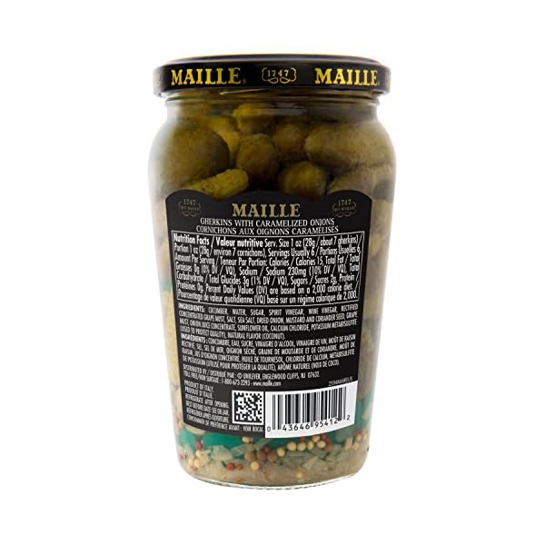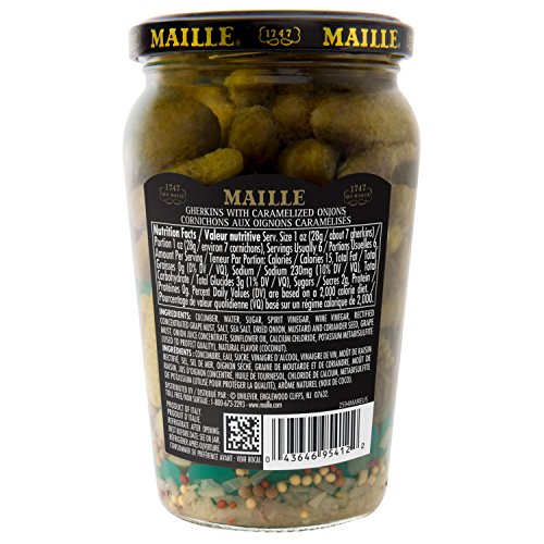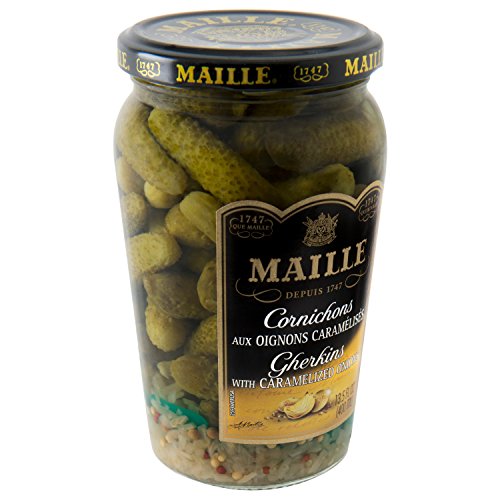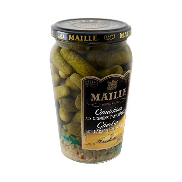 The Maille cornichon gherkin with caramelized onions takes a twist on classic cornichon recipe. They amazingly pair the sweetness of roasted onions with the delicate and fruity white condiment – a blend of white wine balsamic vinegar and grape must. The Maille cornichons gherkins with caramelized onions add great texture and interest to classic dishes like quality burger, grilled cheese, potato salad, tartar sauce, salad dressing. You can enjoy these alongside cold roasted meats, fresh cheese or charcuterie board. The Maille cornichons gherkins with caramelized onions are also delicious to snack on any time or to make a relish. This recipe will satisfy the most discerning foodies with cornichons packed with crunchiness and bursts of flavor. Its unique combination offer new variety for those who regularly enjoy classic cornichons and open a new realm of possibilities in the kitchen. The Maille cornichons gherkins are produced according to time-honored French food tradition according to a rigorous production process that makes them an connoisseur treat. With 270 years of expertise, Maille sets the standard for Dijon mustard and is an ambassador of French culinary refinement around the world. Established by Antoine-Claude Maille in 1747, the house of Maille was the official supplier to the kings of France and many European royal courts.