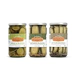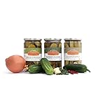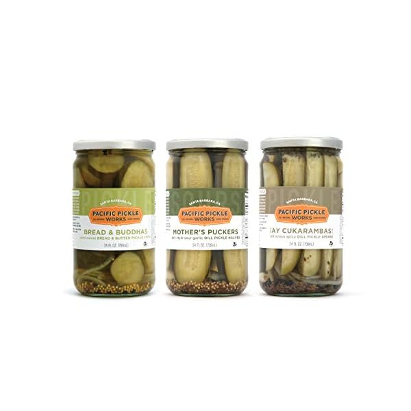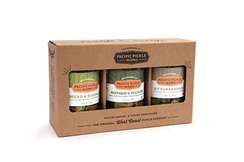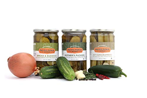 Get all three of Pacific Pickle Works’ pickle varieties in one attractive gift box. If you are a pickle lover, this set is for you! This set includes our traditional deli-style sugar free sour halves, Mother’s Puckers, our thick cut semi-sweet bread & butter style pickles, Bread & Buddhas, and our original jalapeño spiced garlic dill spears, ¡Ay Cukarambas! All three are Kosher certified and non-GMO Project Verified.
